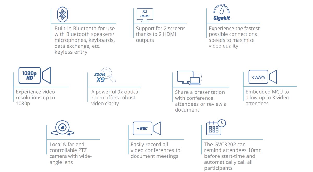 Това е автоматичен превод. Оригиналния текст може да видите тукGrandstream GVC3202 е система за видеоконферентна връзка, която можем (с известно преувеличение) да считаме за прилична алтернатива за телепортиране. Вместо да пътувате през червейна дупка, вие ще пътувате по мрежата с модела по целия свят, ако разбира се искате... Моделът принадлежи към категорията комуникационни устройства, които се използват за предаване на видео, аудио или споделяне на документи и настолни компютри между участници, които се намират на различни места. Той е чудесен помощник както за вътрешни срещи, така и за комуникация с клиенти или доставчици. Той опростява споделянето на информация между заинтересованите страни, което може да допринесе за по-бързото вземане на решения и цялостната ефективност на работата. Гамата Grandstream GVC носи функции в малкия сегмент за видеоконференции, които познавате само от високо професионални продукти в тази категория. В случай, че търсите устройство за разширяване на съществуващото ви решение, добрата новина е, че гамата GVC е съвместима с други производители. GVC3202 има камера с Full HD резолюция. Ще оцените перфектно показаните детайли на изображението, особено при представяне на продукта, работа с флипчарт или дори само в началото на срещата, когато показвате визитната си картичка на другата страна. Кодекът H.264 се грижи за спестяващата време видео компресия, което гарантира бързо и гладко предаване на данни с по-ниски изисквания не само към вашия компютър, но и към линията за данни. Монитор, телевизор или проектор за данни могат да се използват като устройство за извеждане на изображение. За още по-широка и по-удобна употреба можете да разчитате на VGA, HDMI вход или USB 2.0 порт. Ние изчисляваме възвръщаемостта на инвестицията в рамките на спестените часове, иначе необходими за преодоляване на пътуването, пътните разходи, безопасността или дори само спестените нерви. Ако искате да помогнете при проектирането на решение за видеоконферентна връзка „до ключ“, не се колебайте да се свържете с вашия дилър. - 1080p Full-HD видео, 3-посочна видеоконференция, поддръжка за свързване на 2 монитора през HDMI - PTZ камера с 9x оптично увеличение - операционна система Android с възможност за използване на Google Play, която позволява инсталиране на приложения като Skype, Google Hangouts и още - Интегриран Bluetooth, Gigabit портове, видеозапис - Споделяне на екрана чрез HDMI / VGA вход - Лесна инсталация - Възможност за запазване на предварително зададени позиции за заснемане на камерата - Планиране на срещи - Plug and Play за свързване на конференция към облачното решение за видеоконферентна връзка IPVideoTalk на Grandstream