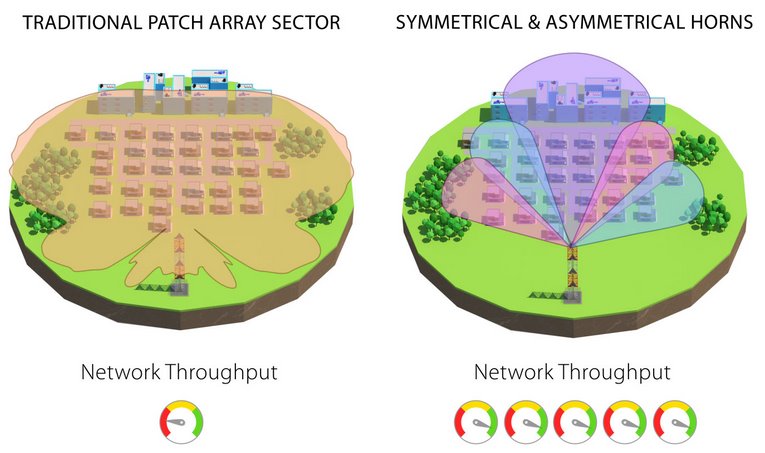Основните секторни антени с решетка имат изключително широка диаграма на излъчване по азимут и изключително плоска в равнината на издигане. Ако AP е разположен на висока кула, клиентите в близост до кулата страдат от ниско ниво на AP сигнал. Асиметричните рупорни TP антени осигуряват ценни допълнителни градуси в ширината на елевационния лъч, като свиват нулевата зона, като същевременно запазват увеличеното усилване за производителност на дълги разстояния.
