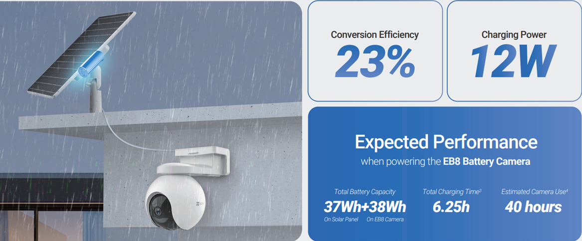 Този панел използва монокристални слънчеви клетки за зареждане на камери с висок процент на преобразуване с ефективност до 23% .