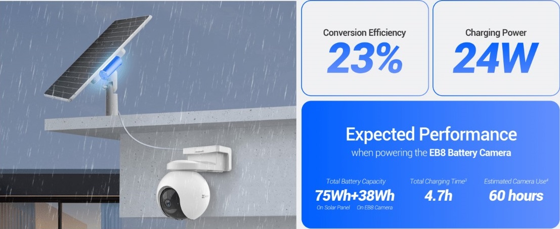 Този панел използва монокристални слънчеви клетки за зареждане на камери с висок процент на преобразуване с до 23% ефективност.