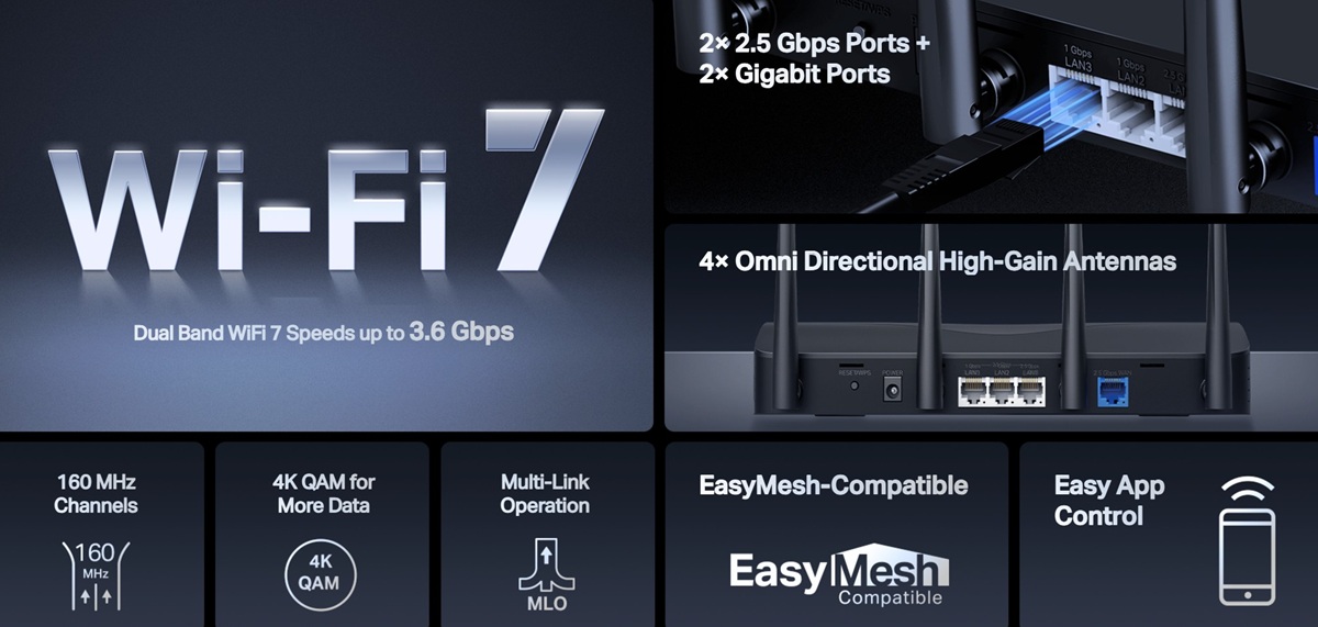 Рутерът е оборудван с 2.5G WAN порт, 2.5G LAN порт и 2x 1G LAN порта, което ви позволява да се възползвате максимално от скоростта на вашата мрежа. Ултрабързи връзки с вашия NAS, смарт телевизор или игрална конзола са гарантирани.