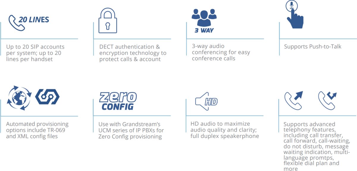 - Поддържа разширени телефонни функции, включително прехвърляне на повиквания, пренасочване на повиквания, изчакване на повикване, режим „Не безпокойте“, индикация за изчакващо съобщение, многоезични подкани, гъвкав план за набиране и други