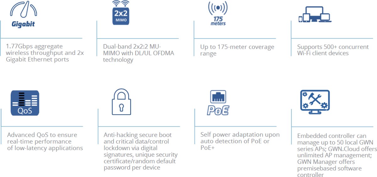 - Вграденият контролер може да управлява до 50 локални точки за достъп от серията GWN; GWN.Cloud предлага неограничено управление на точки за достъп; GWN Manager предлага софтуерен контролер, базиран на място