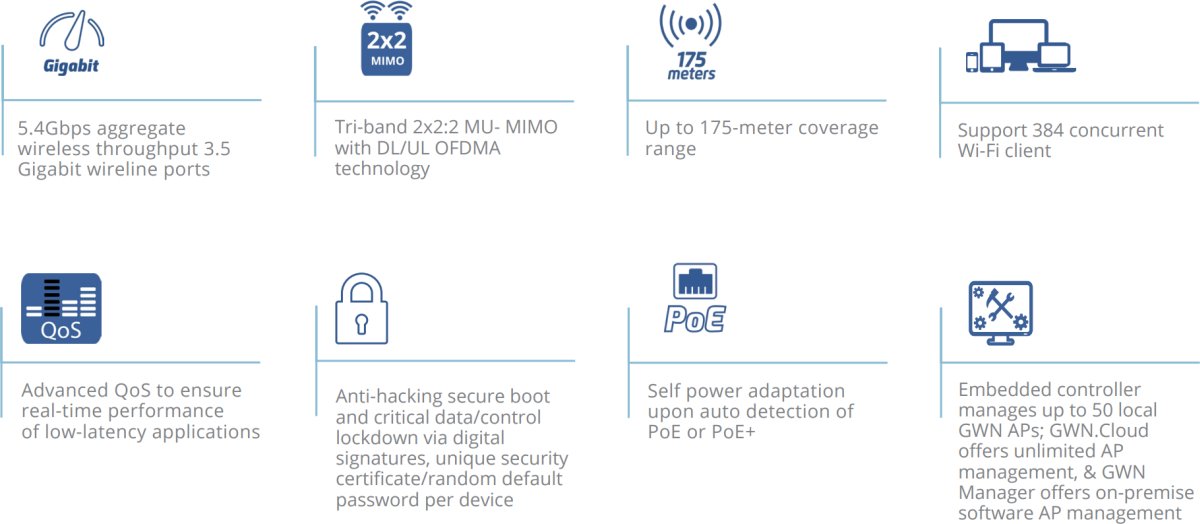 - Вграденият контролер може да управлява до 50 локални точки за достъп от серията GWN; GWN.Cloud предлага неограничено управление на точки за достъп; GWN Manager предлага софтуерен контролер, базиран на място