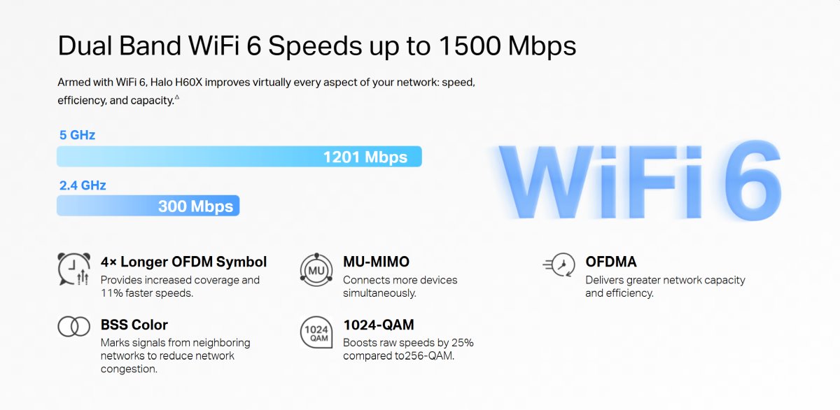 - Двубандовият WiFi 6 предлага скорости до 1500 Mbps – до 1201 Mbps на 5 GHz и до 300 Mbps на 2.4 GHz.