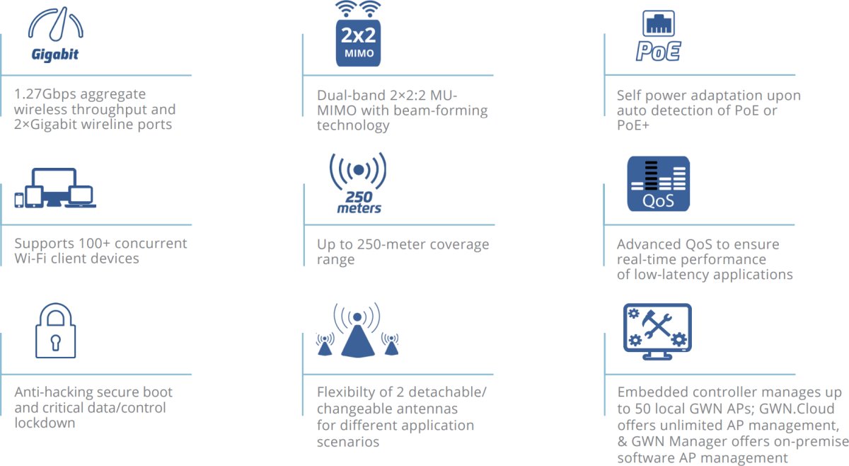 - Вграденият контролер управлява до 50 локални GWN точки за достъп; GDMS Networking предлага неограничено управление на точки за достъп, а GWN Manager предлага локално софтуерно управление на точки за достъп.