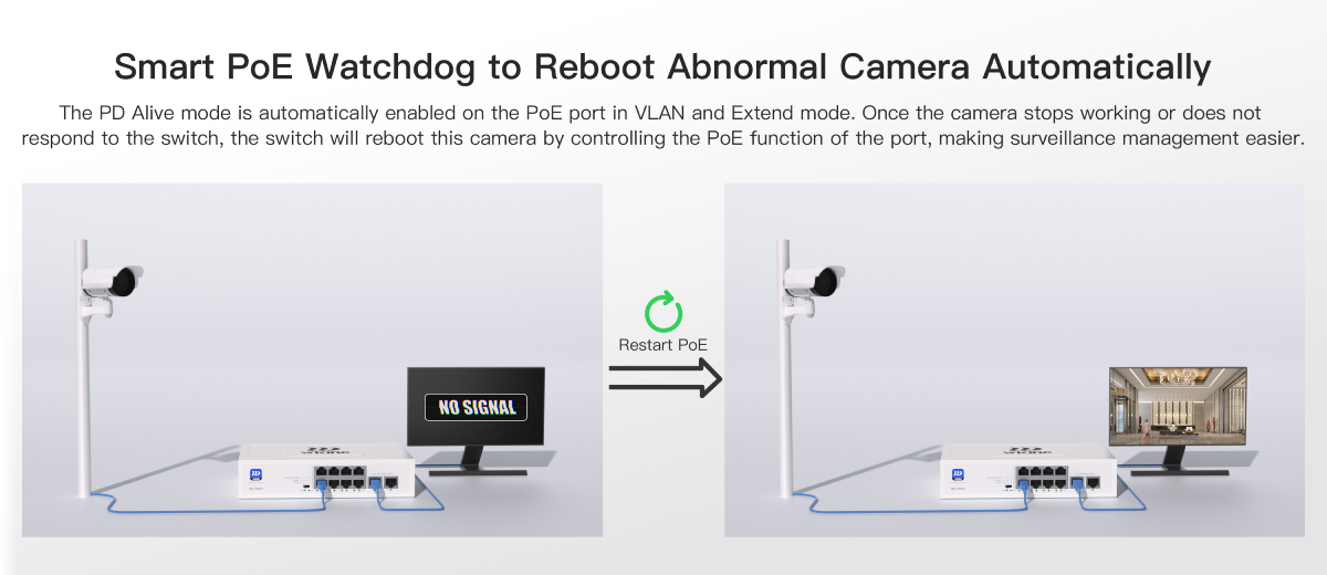 Функцията PD Alive автоматично разпознава дали свързано устройство (напр. IP камера) реагира. Ако камерата спре да реагира, превключвателят автоматично я изключва и включва отново. Това осигурява непрекъсната работа на системата за наблюдение без намесата на администратор.