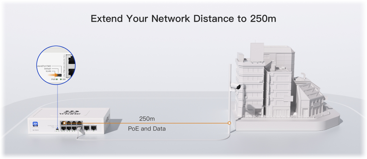 В режим Extended, комутаторът може да захранва и да предава данни на устройства на разстояние до 250 метра (с ограничение на скоростта от 10 Mbps). Това е идеално за разполагане на камери в по-големи зони, където стандартното PoE достига лимита си от 100 м.