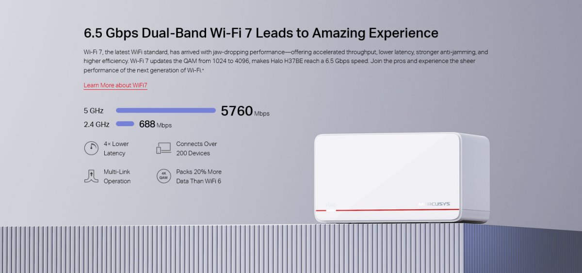 Това е автоматичен превод. Оригиналния текст може да видите тукWi-Fi 7, най-новият WiFi стандарт, пристигна с изумителна производителност – предлагайки ускорена пропускателна способност, по-ниска латентност, по-силна защита от заглушаване и по-висока ефективност. Wi-Fi 7 актуализира QAM от 1024 на 4096, което позволява на Halo H37BE да достигне скорост от 6,5 Gbps. Присъединете се към професионалистите и се насладете на чистата производителност на следващото поколение WiFi.