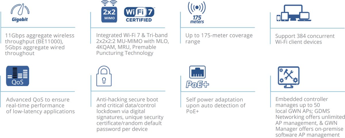 - Вграденият контролер управлява до 50 локални GWN точки за достъп; GDMS Networking предлага неограничено управление на точки за достъп, а GWN Manager предлага локално софтуерно управление на точки за достъп.