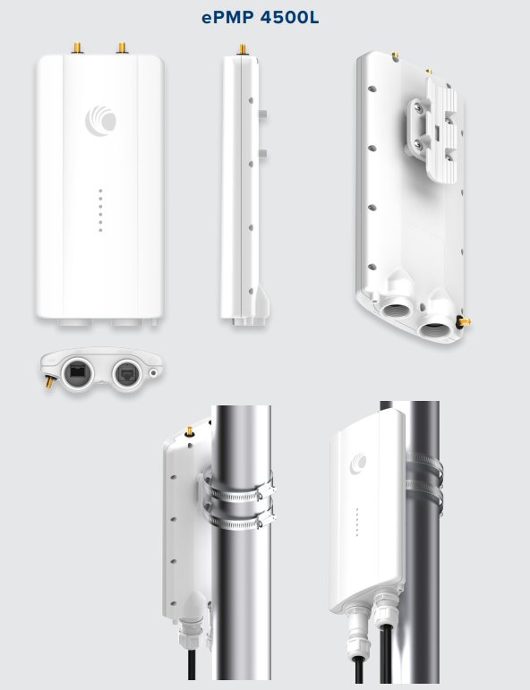 Точка за достъп ePMP 4500L, предлагаща висок капацитет и гъвкава свързаност със секторни и рупорни антени. ePMP 4500L разполага с 2x2 MIMO , тази точка за достъп е конекторизирана с два RP-SMA за използване със секторна антена Cambium Networks 90°/120°. Това устройство е съвместимо и с адаптер RF Elements Twistport™ за ePMP. С най-новите технологии от 802.11ax, 1024QAM и 80 MHz честотна лента, тази точка за достъп осигурява производителност над 1 Gbps.
