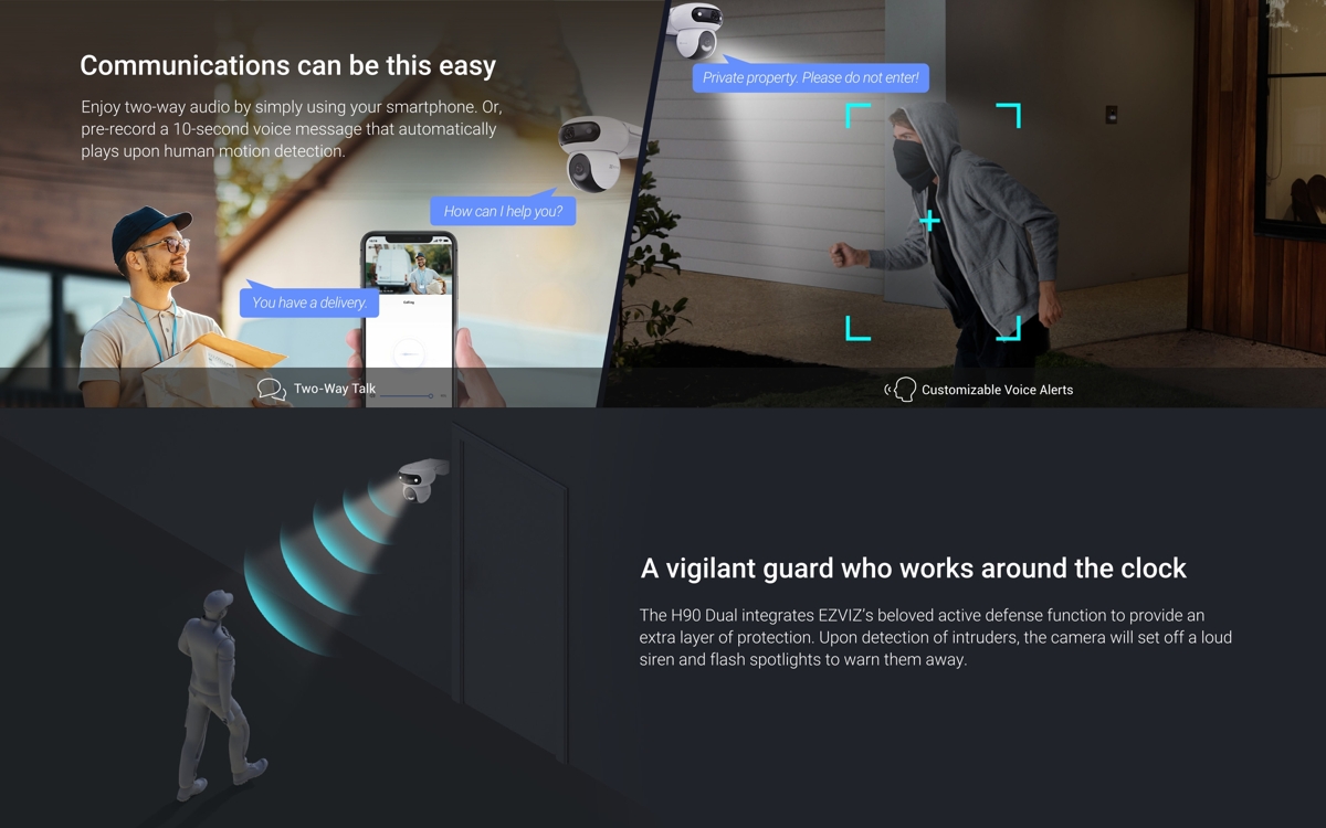 Това е автоматичен превод. Оригиналния текст може да видите тукДвойната Wi-Fi камера Ezviz IP PT H90 Dual разполага с (2) 4MP сензора (2560 x 1440 px), защита от атмосферни влияния IP65 , комбинирано IR/бяло осветление за нощно виждане до 30 м + мигане (стробоскоп и звукова аларма) и двупосочно аудио. Сензорът Bullet има фиксиран обектив 2.8 мм (96°) , а PTZ сензорът има фиксиран обектив 6 мм (52°) . Камерата може да бъде свързана към мрежата чрез Wi-Fi 4 или 10/100Mbps порт .