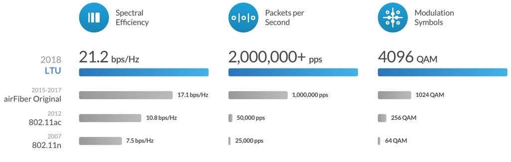 Сравнение на спектралната ефективност на 802.11n, 802.11ac, airFiber Original и LTU по години.