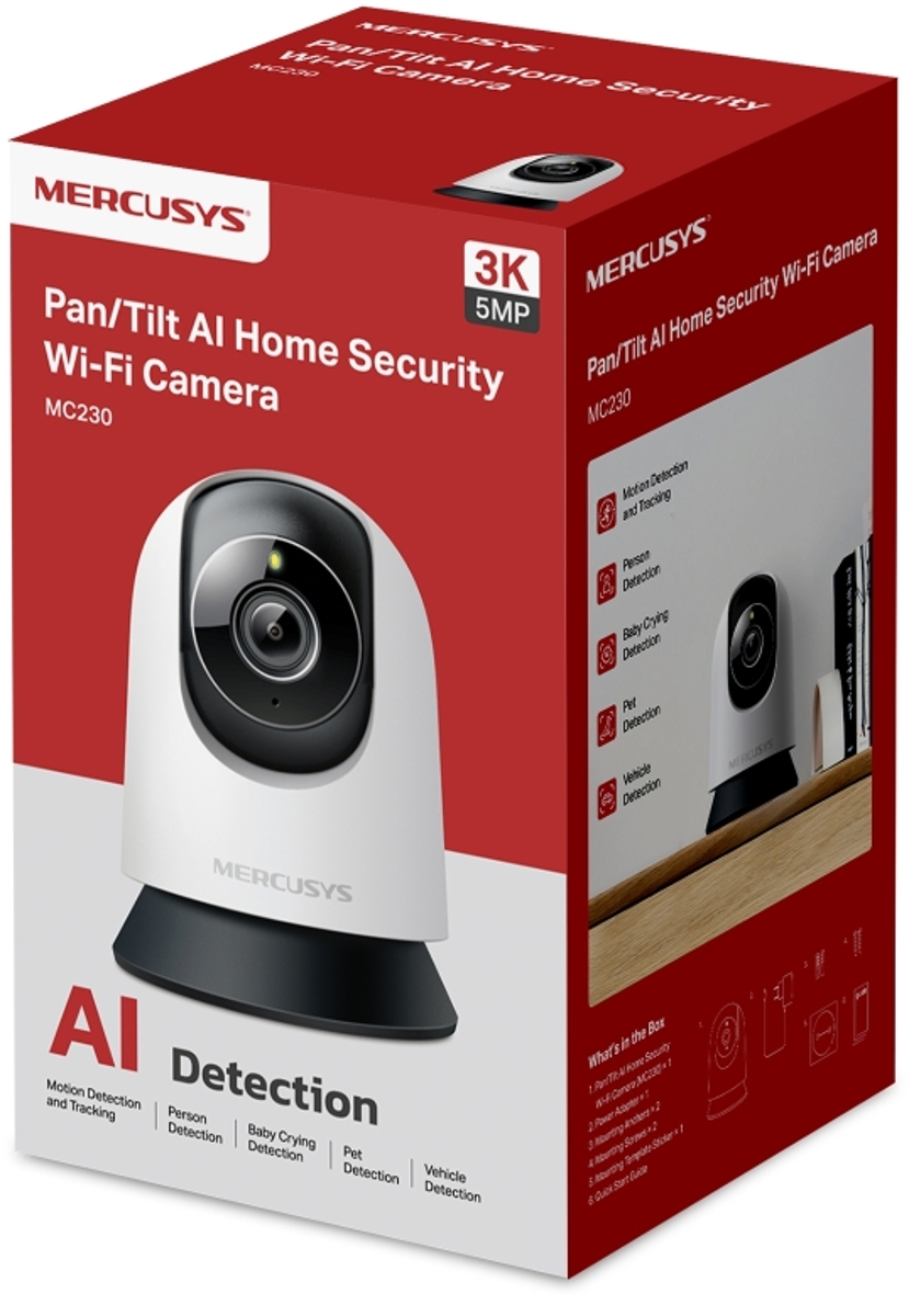The MERCUSYS MC230 is a 360° pan-tilt home security Wi-Fi camera equipped with a 5MP sensor (2880 x 1620 px) at 30fps, a fixed 4mm (86°) lens, adaptive IR illumination for night vision up to 12m and a built-in microphone and speaker. The camera connects to the network exclusively via Wi-Fi 4.