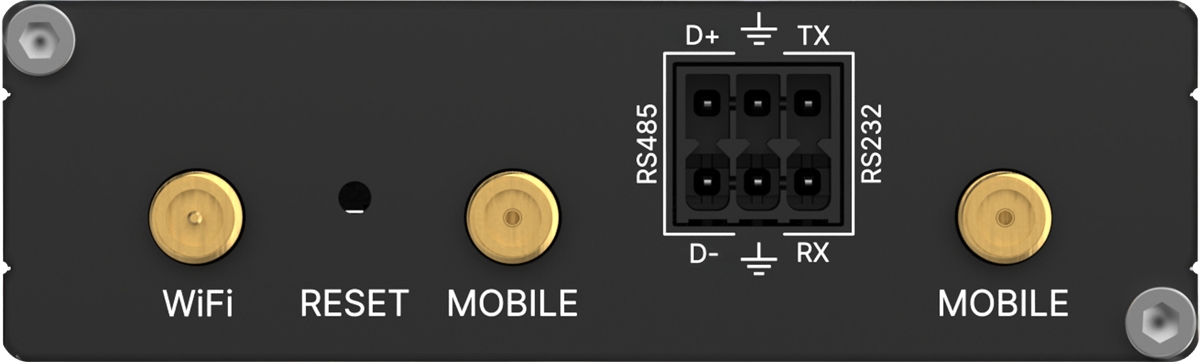 The Teltonika RUT206 is an industrial 4G LTE Wi-Fi 4 router with (2) 10/100Mbps ports (LAN + configurable LAN/WAN), (2) SMA female connectors for external LTE antennas, (1) RP-SMA female connector for an external Wi-Fi antenna, (1) RS232/RS485 serial interface and (2) mini SIM slots.