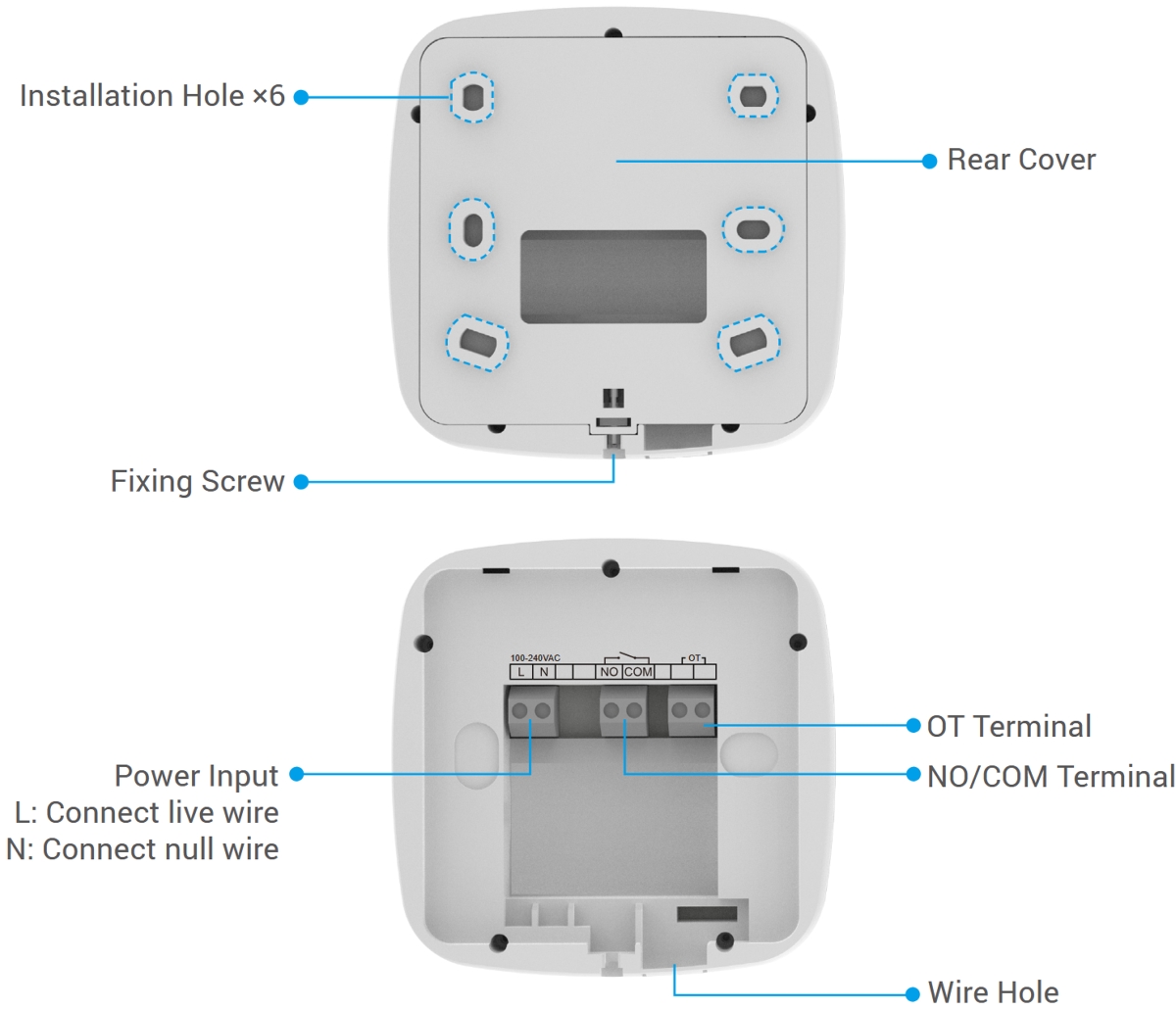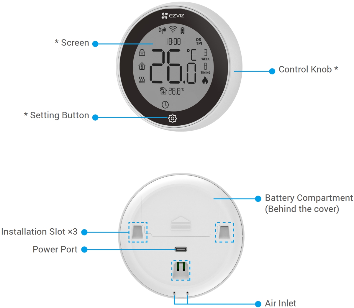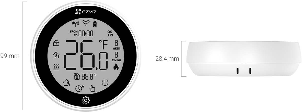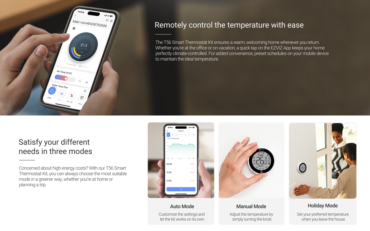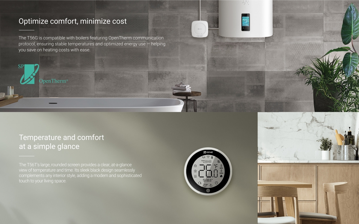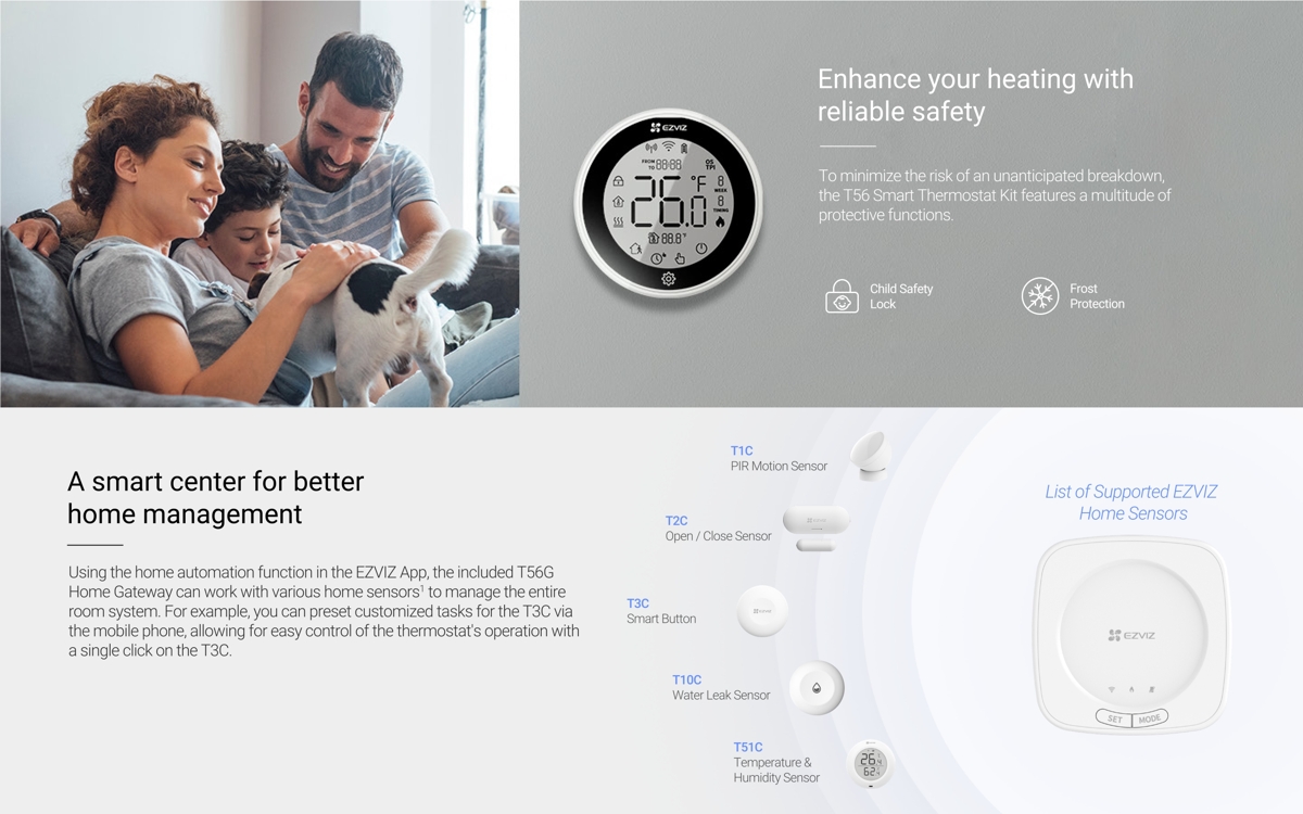 The Ezviz T56 is a kit of the T56T thermostat and the T56G gateway. It enables intelligent heating management, supports communication with OpenTherm boilers and automation via the EZVIZ app, including integration with additional sensors (requires connection through the A3 home gateway). The system can also be controlled remotely anytime, anywhere. It offers automatic, manual and holiday modes, along with a child safety lock and frost protection.