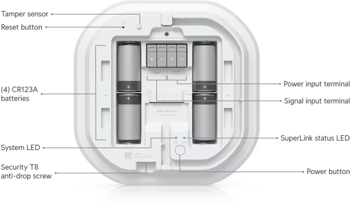 The Ubiquiti USL-Siren is a wireless UniFi Protect siren with visual signaling (illuminated red ring). It communicates with the gateway using the proprietary SuperLink protocol with range of up to 2km (in open space). Thanks to its IP56 rating, it is suitable for both indoor and outdoor wall or ceiling installation. The siren is powered by (4) CR123A batteries (included) and reaches a sound level of up to 110dB. The device is also equipped with a 12-24V DC power input and a signal input.