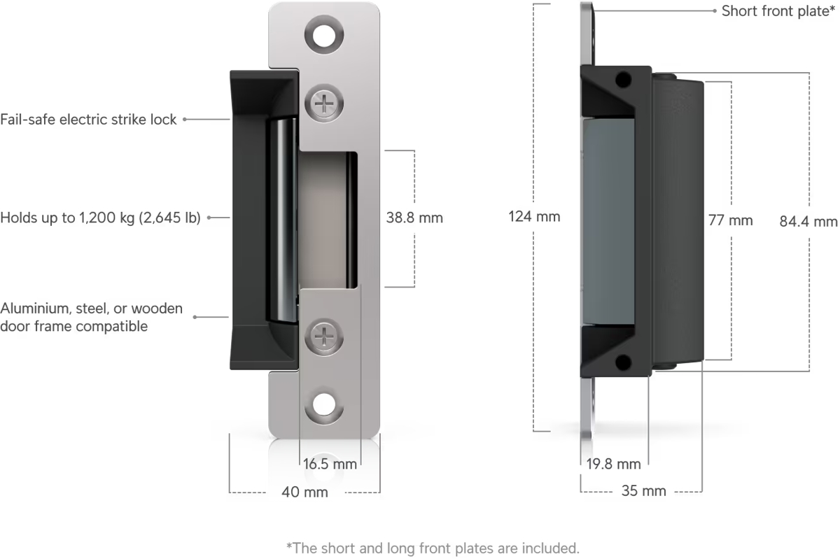 The Ubiquiti UACC-Lock-Strike-Safe-15mm is an electric strike lock that connects to a UniFi Access Hub. The lock is fail-safe, unlocking in the event of failure. It can be installed in wooden, steel, and aluminum frames. Holding force of up to 1200 kg. Power is supplied via a two-wire terminal block 12V/400mA.