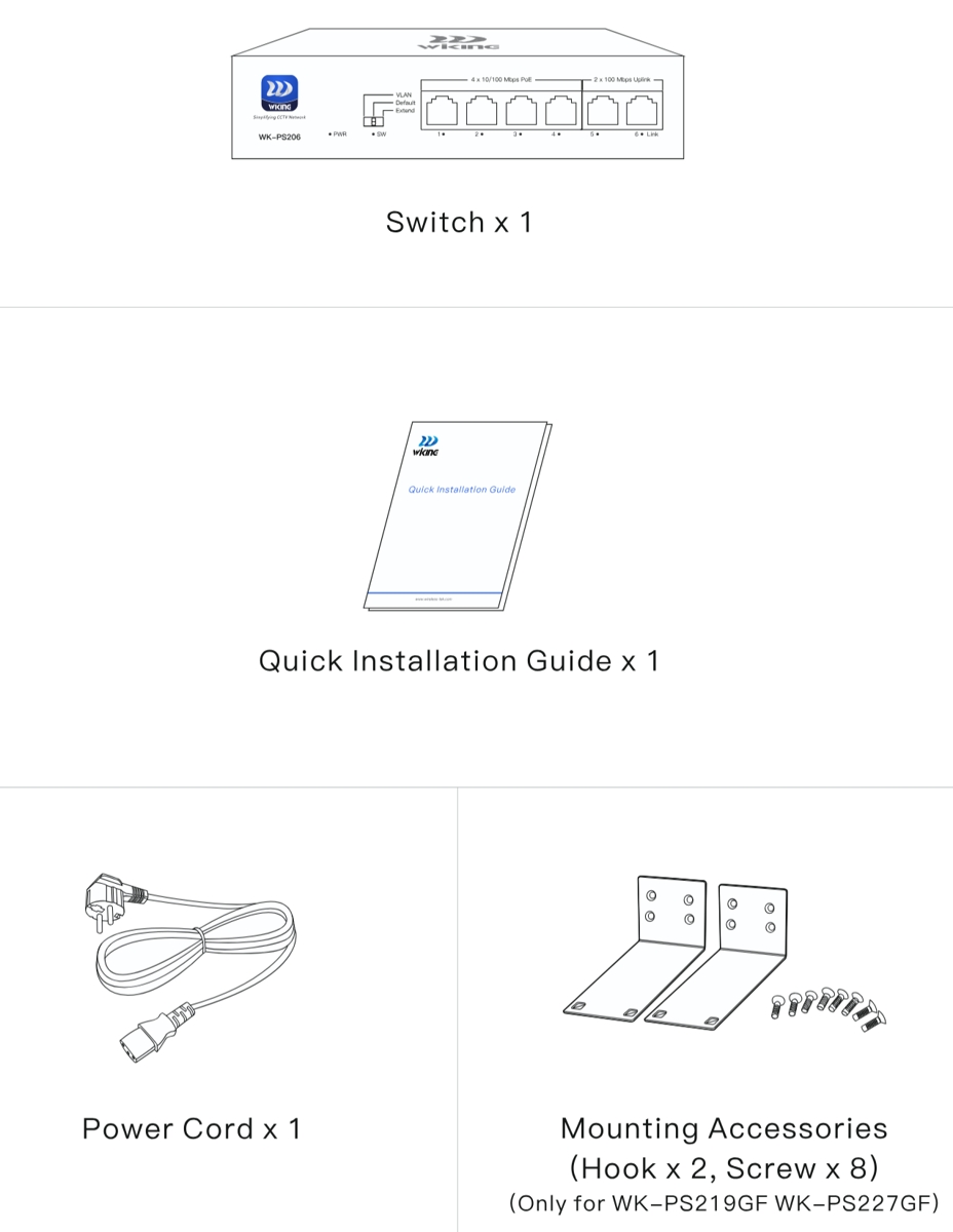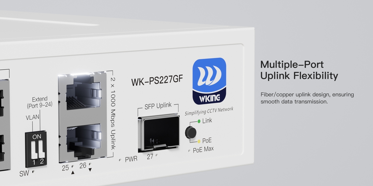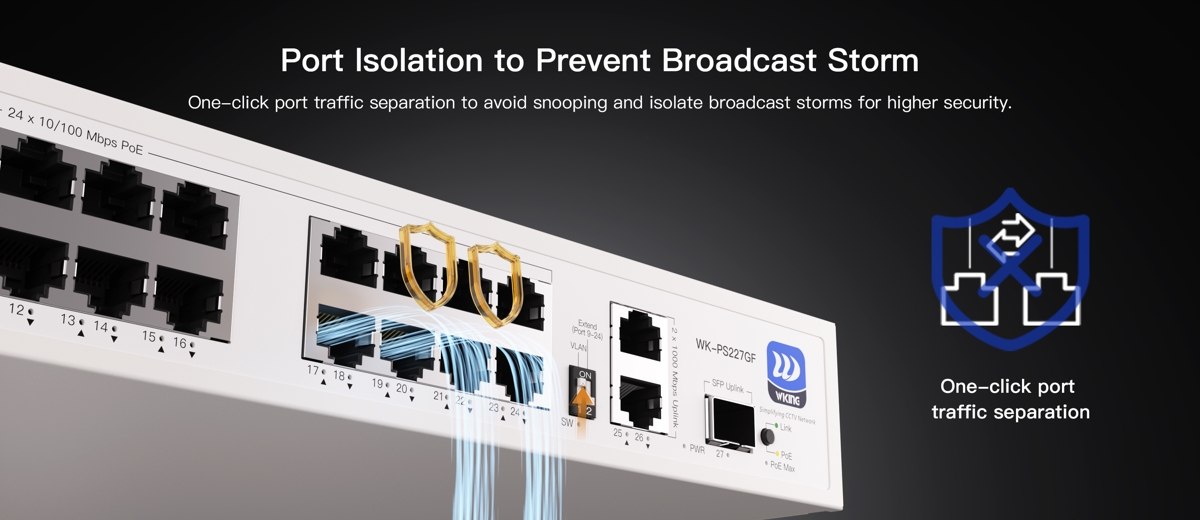 The Wiking WK-PS227GF is a reliable unmanaged PoE L2 switch with a switching capacity of 10.8Gbps, (24) 10/100Mbps PoE ports, (2) 1Gbit uplink ports and (1) SFP uplink slot. The downlink ports support PoE with a 270W budget. The switch is ideal for CCTV installations thanks to PoE, automatic IP camera reboot in case of connection failure and the option to extend the transmission distance of PoE ports up to 250m. The switch consumes 10W (without load).