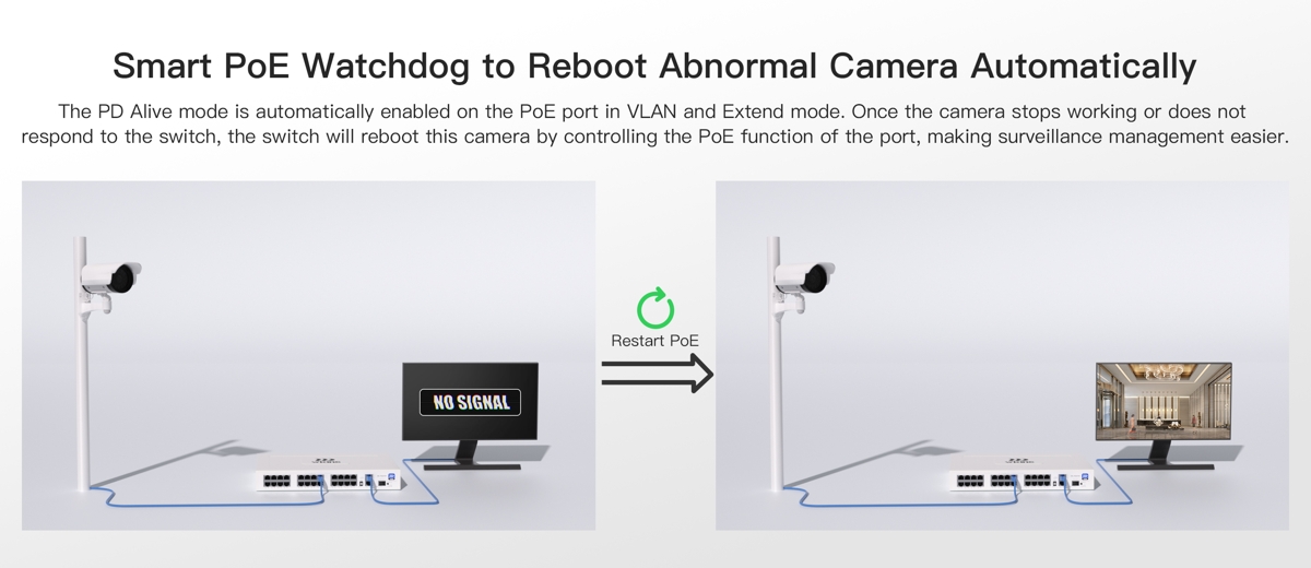 - VLAN - enables port isolation, where each PoE port can transmit data only to the uplink ports, and the PD Alive function, which automatically reboots dropped or unresponsive PoE devices