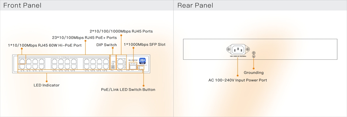 - (24) 10/100Mbps PoE ports, (2) 1Gbit uplink ports and (1) SFP uplink slot