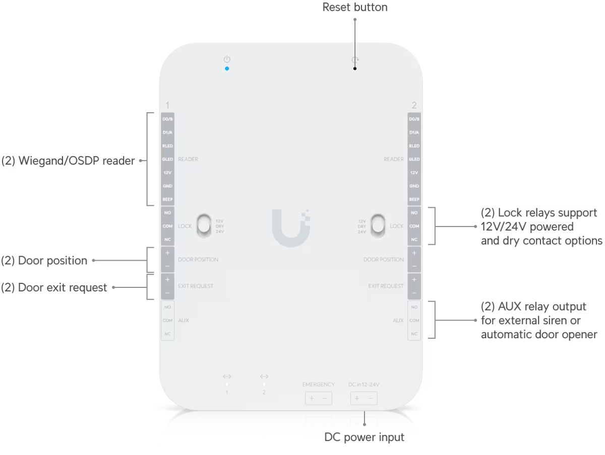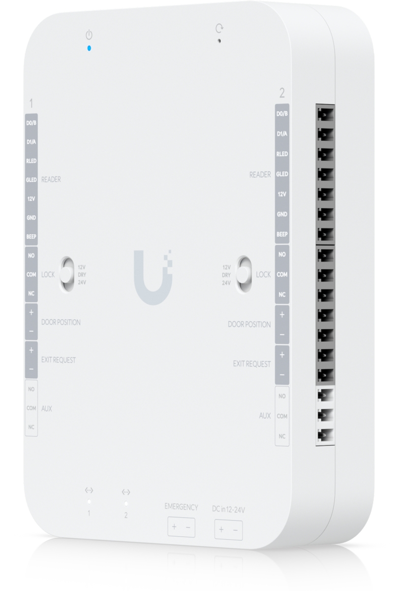 The Ubiquiti UniFi Access Retrofit Hub is designed to control up to 2 doors using existing cabling . It features (2) Wiegand/OSDP reader inputs, (2) relay outputs (configurable 12V/1A, 24V/0.5A, or dry), (2) 10/100Mbps ports, digital inputs for connecting (2) exit buttons and (2) door position sensors and (1) emergency input and output. Power is supplied via a 12-24V DC terminal block with the option to connect a backup battery using the UACC-Retrofit-PSU-12V.