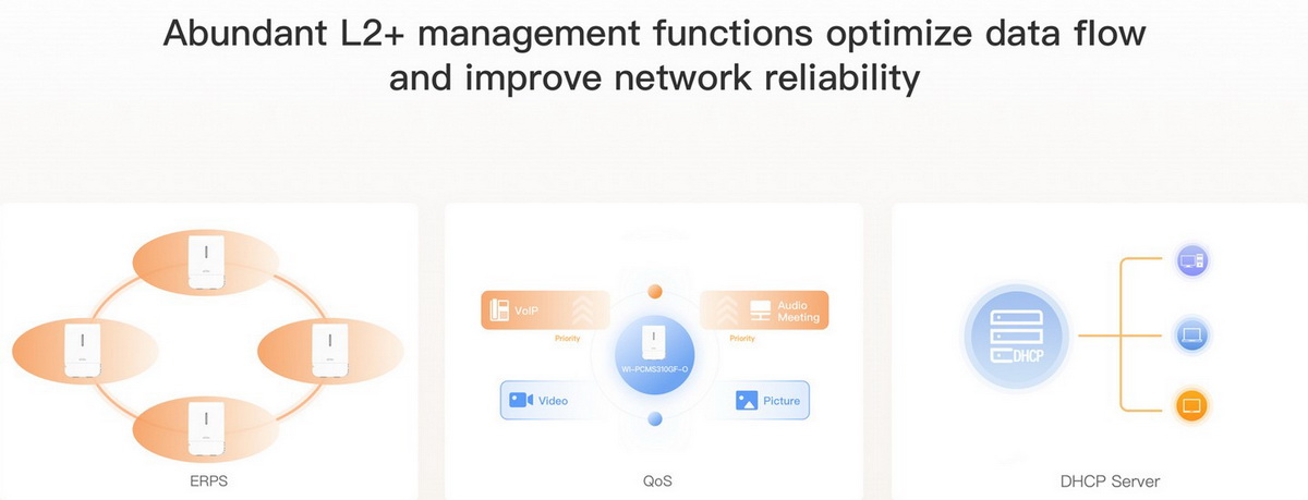 - Advanced Management: L2+ management, 802.11Q VLAN, LACP, STP/RSTP/MSTP, IGMP snooping, 802.11x, static routing, DHCP.