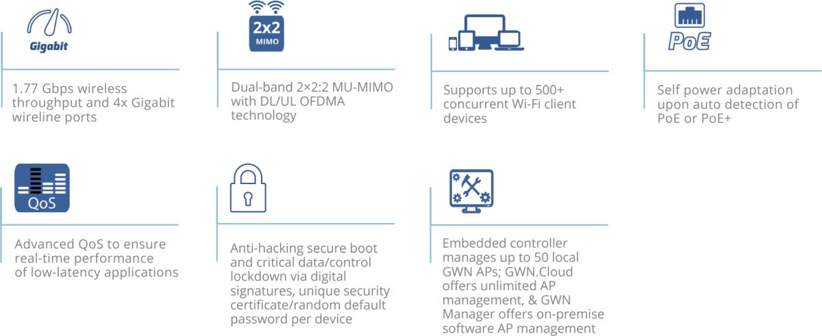 - Вграденият контролер управлява до 50 локални GWN точки за достъп; GDMS Networking предлага неограничено управление на точки за достъп, а GWN Manager предлага локално софтуерно управление на точки за достъп.