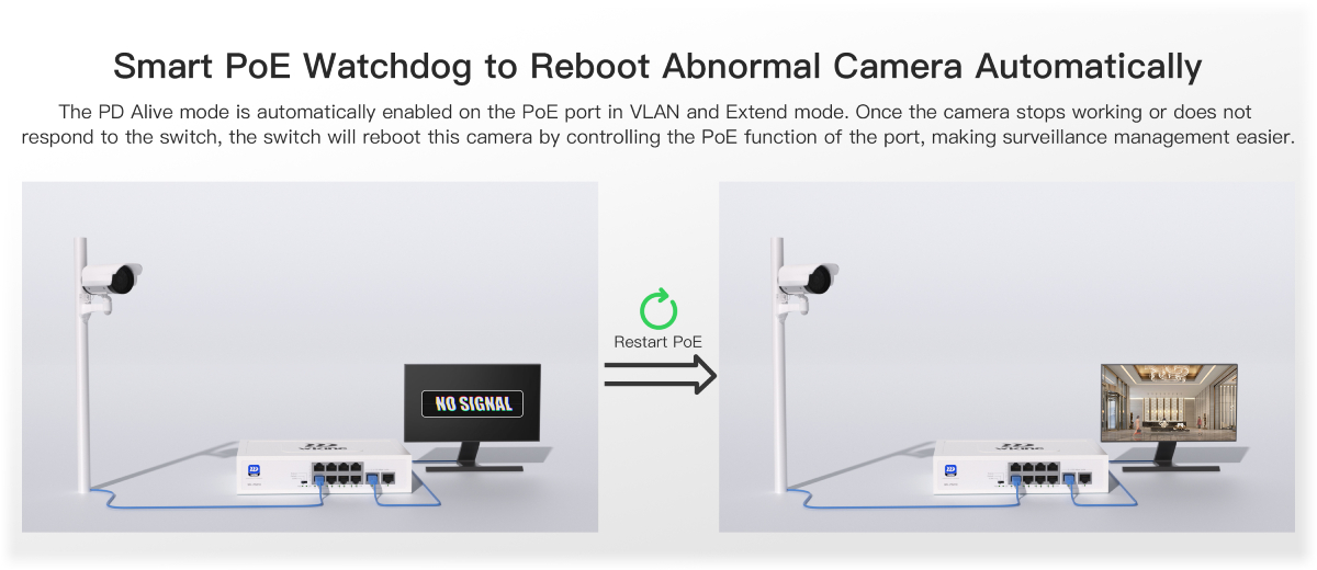 Функцията PD Alive автоматично разпознава дали свързано устройство (напр. IP камера) реагира. Ако камерата спре да реагира, комутаторът автоматично ще изключи и рестартира порта. Това гарантира непрекъсната работа на системата за наблюдение без намесата на администратор.