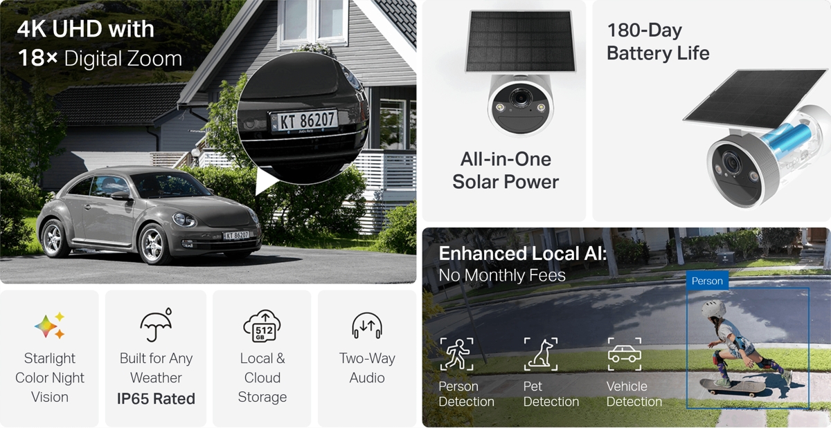 Това е автоматичен превод. Оригиналния текст може да видите тукУмната безжична IP камера TP-Link Tapo C465, захранвана от слънчева енергия, разполага с 8MP сензор (3840 x 2160 px) при 15 кадъра в секунда, фиксиран 3.17 мм (113°) обектив , хибридно IR/бяло осветление за нощно виждане до 13 м + звукова аларма , защита от атмосферни влияния IP65 и двупосочно аудио . Камерата може да бъде свързана към мрежата чрез Wi-Fi 4 .