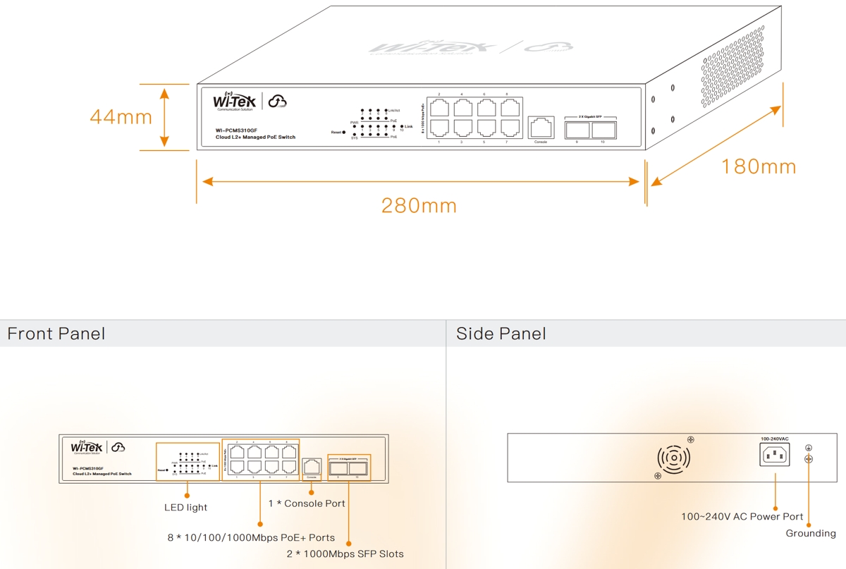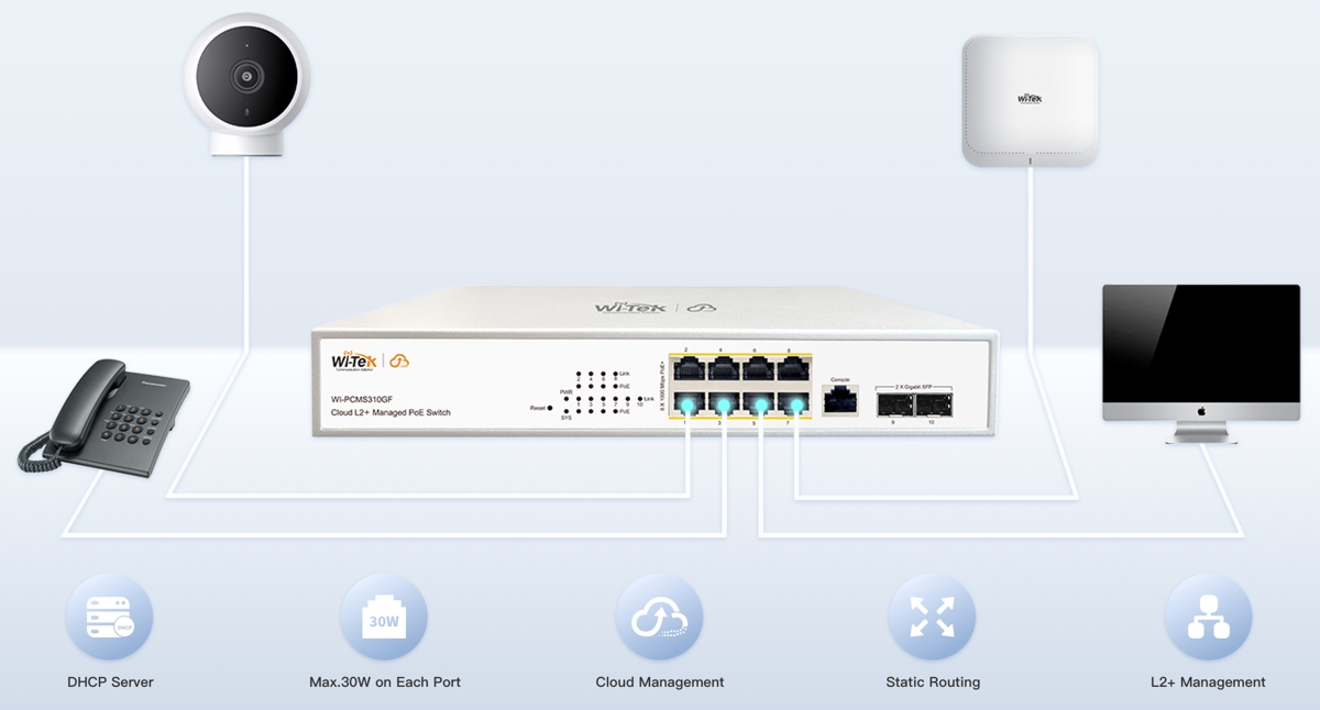 Това е автоматичен превод. Оригиналния текст може да видите тукWi-Tek WI-PCMS310GF V2 е надежден управляван L2+ гигабитов облачен PoE комутатор с комутационен капацитет от 20 Gbps , (8) Gbit PoE+ порта и (2) SFP слота . Портовете за връзка към мрежата поддържат PoE+ с изходна мощност до 30W/порт и PoE бюджет от 140W . Комутаторът е идеален за бизнес среди, изискващи разширено управление на мрежата, облачен контрол и разширени L2+ функции. Комутаторът консумира 14,2W (без PoE натоварване).