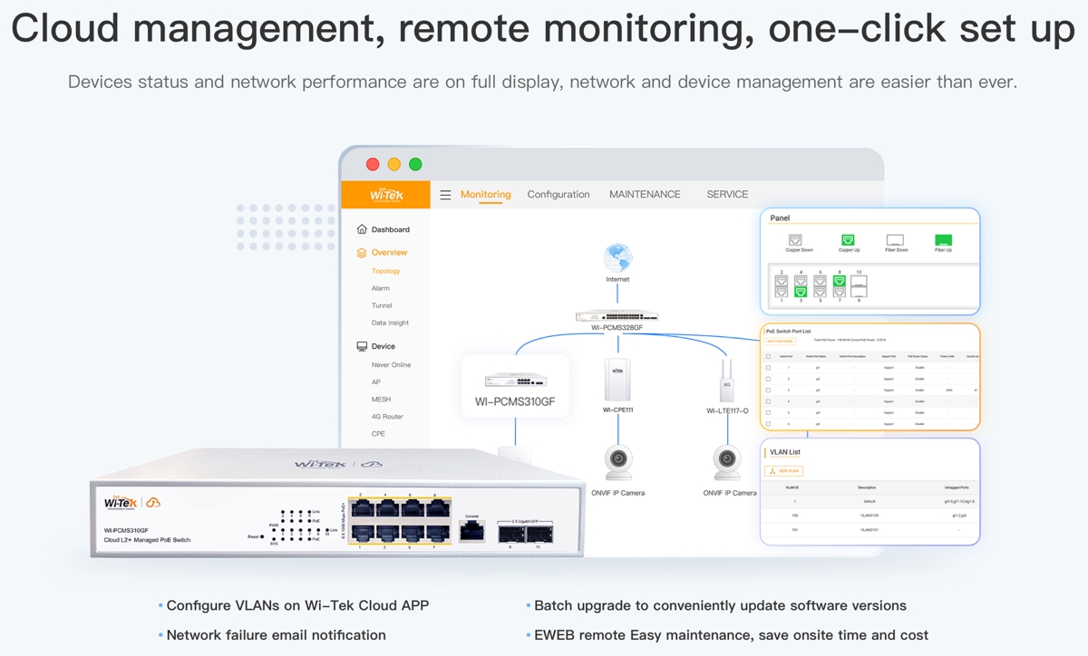 - Управление на облака чрез Wi-Tek Cloud - осигурява ефективно, лесно и сигурно дистанционно управление на устройства, интелигентно внедряване, автоматична мрежова конфигурация и предупреждения за необичайни събития