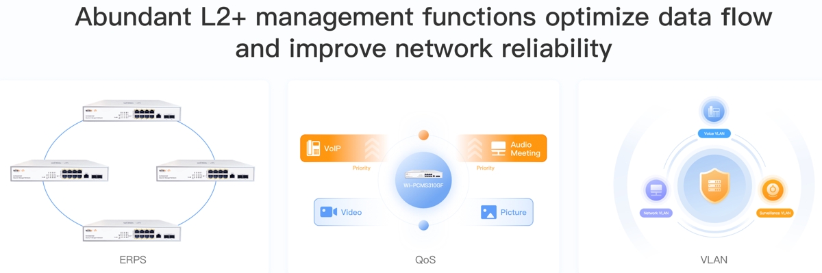 - Автоматично предотвратяване на цикли, VLAN, IGMP и DHCP snooping, QoS и агрегиране на връзки