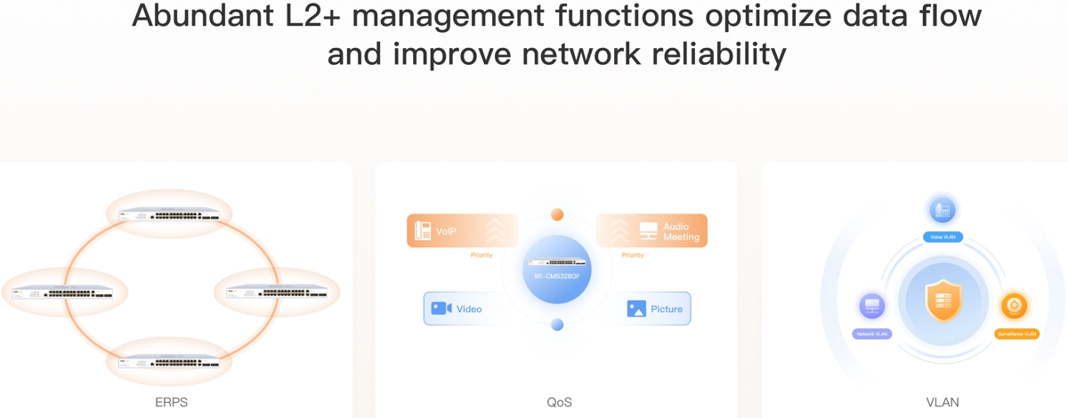 - Автоматично предотвратяване на цикли, VLAN, IGMP snooping, QoS и агрегиране на връзки