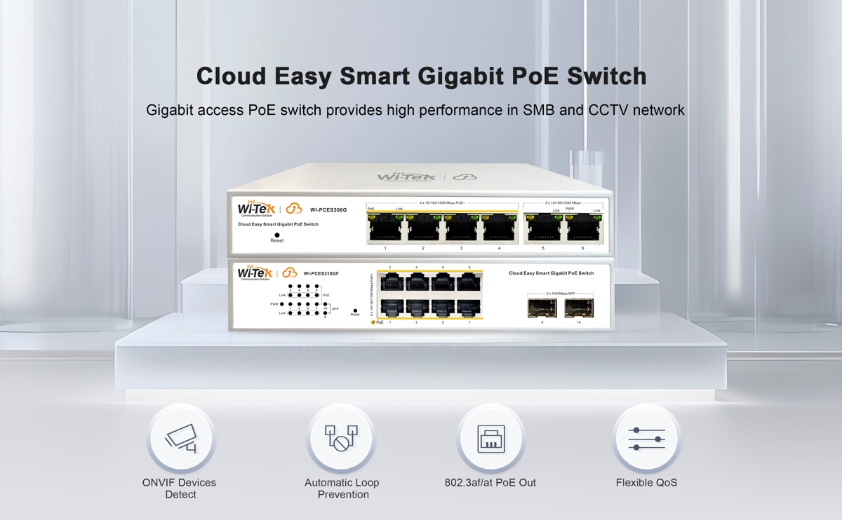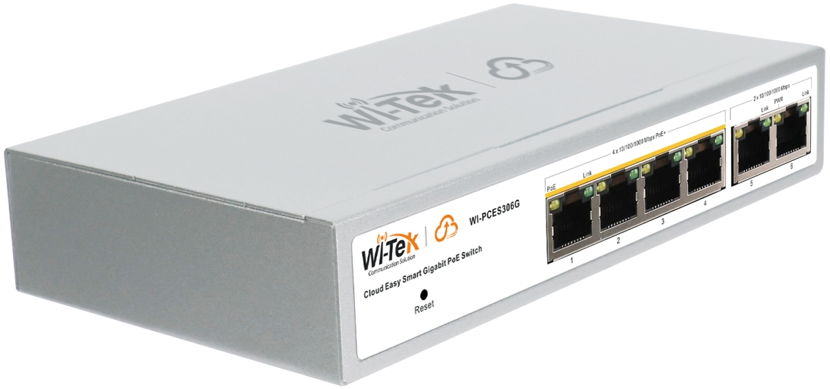 Wi-Tek WI-PCES306G V2 е надежден Easy Smart Gigabit Cloud PoE комутатор с комутационен капацитет от 12 Gbps , (4) Gbit PoE+ порта и (2) Gbit uplink порта . Downlink портовете поддържат PoE+ с изходна мощност до 30W/порт и PoE бюджет от 60W . Комутаторът е идеален за CCTV инсталации благодарение на PoE, автоматично откриване на ONVIF устройства за автоматично разпознаване на камери и автоматично рестартиране на IP камерата в случай на прекъсване на връзката. Комутаторът консумира 5W (без PoE натоварване).