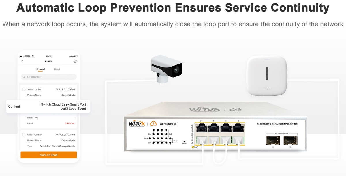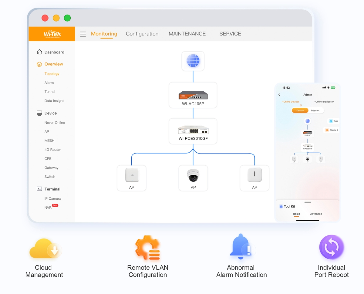 • Управление на облака чрез Wi-Tek Cloud - осигурява ефективно, лесно и сигурно дистанционно управление на устройства, интелигентно внедряване, автоматична мрежова конфигурация и предупреждения за необичайни събития