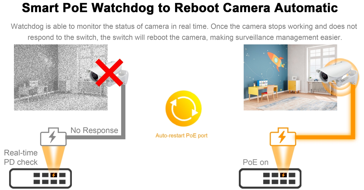 • Автоматично откриване на ONVIF устройства и функция за автоматично рестартиране на IP камерата