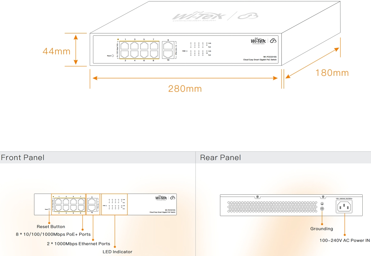 Wi-Tek WI-PCES310G е надежден Easy Smart Gigabit Cloud PoE комутатор с комутационен капацитет от 20 Gbps , (8) Gbit PoE+ порта и (2) Gbit uplink порта . Downlink портовете поддържат PoE+ с изходна мощност до 30W/порт и PoE бюджет от 110W . Комутаторът е идеален за CCTV инсталации благодарение на PoE, автоматично откриване на ONVIF устройства за автоматично разпознаване на камери и автоматично рестартиране на IP камерата в случай на прекъсване на връзката. Комутаторът консумира 7W (без PoE натоварване).