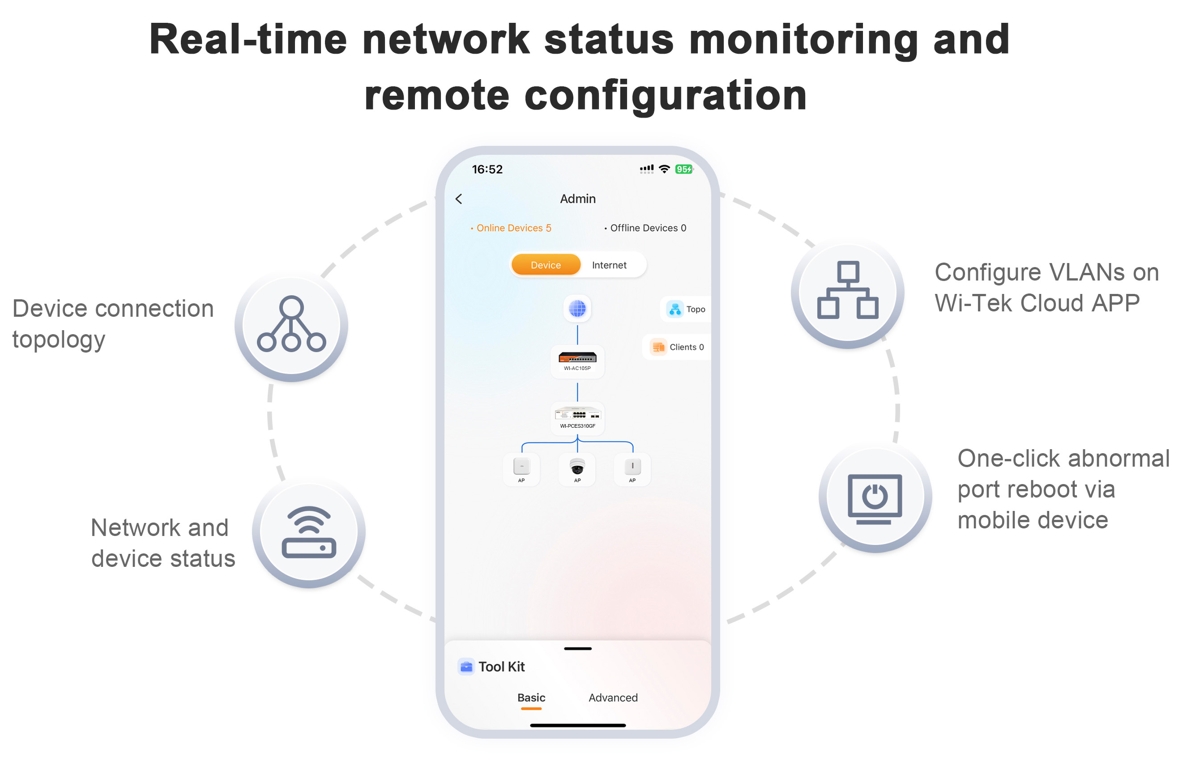 - Управление на облака чрез Wi-Tek Cloud - осигурява ефективно, лесно и сигурно дистанционно управление на устройства, интелигентно внедряване, автоматична мрежова конфигурация и предупреждения за необичайни събития