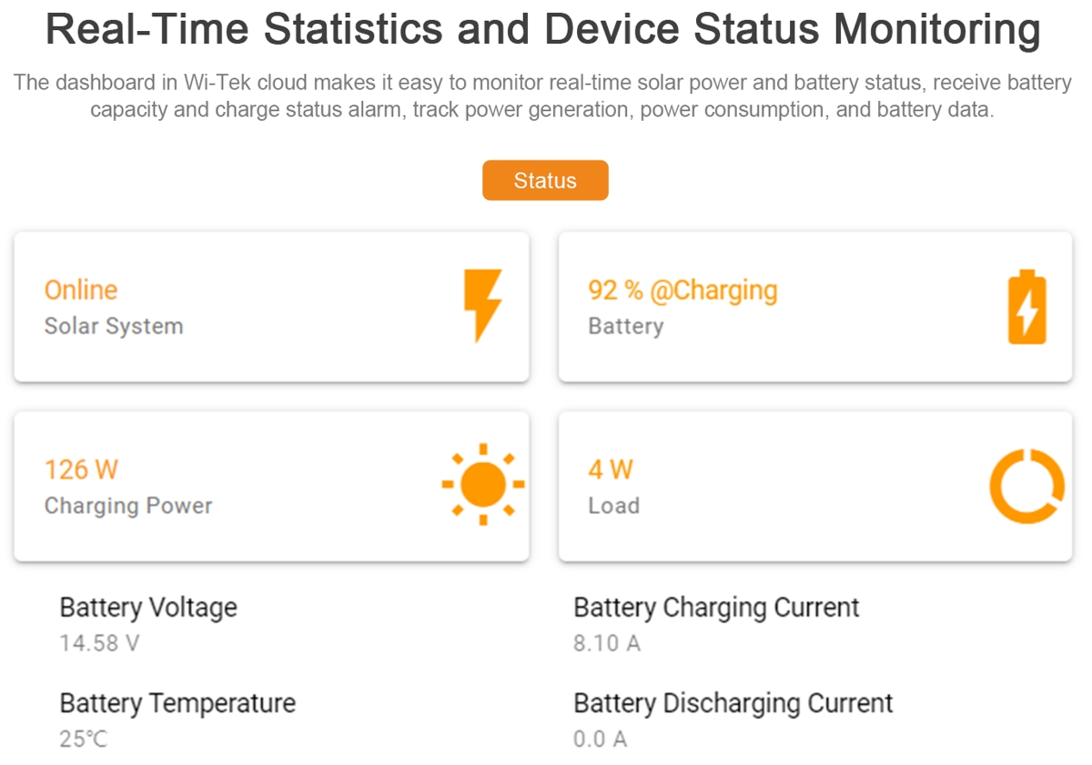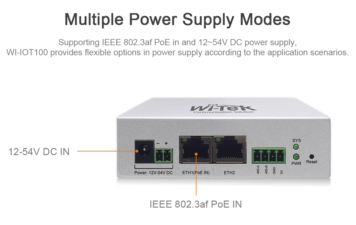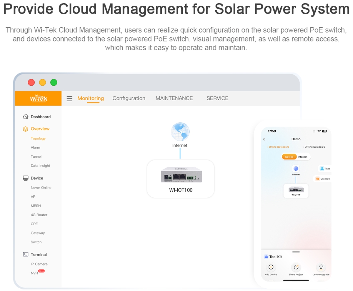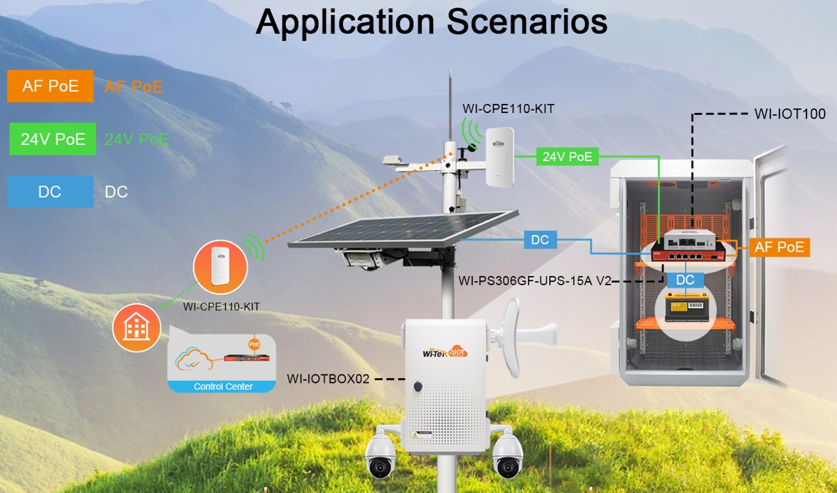 Wi-Tek WI-IOT100 е IoT облачен контролер за захранвани от слънчева енергия PoE комутатори , който позволява дистанционно наблюдение, управление и визуализация на данни за фотоволтаичната система и батерията (включително наблюдение в реално време и тенденции) чрез Wi-Tek Cloud . Устройството разполага с (1) 10/100Mbps PoE-In порт , (1) 10/100Mbps порт и (1) RS-485 за комуникация със соларния комутатор . Захранването може да се осигури чрез PoE или 12-54 VDC конектори.