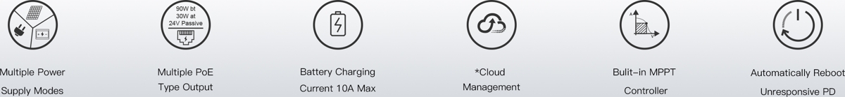 - Портове 4-5 поддържат PoE+ 802.3af/at с изходна мощност до 30W/порт или 24V пасивно PoE (24W/порт)