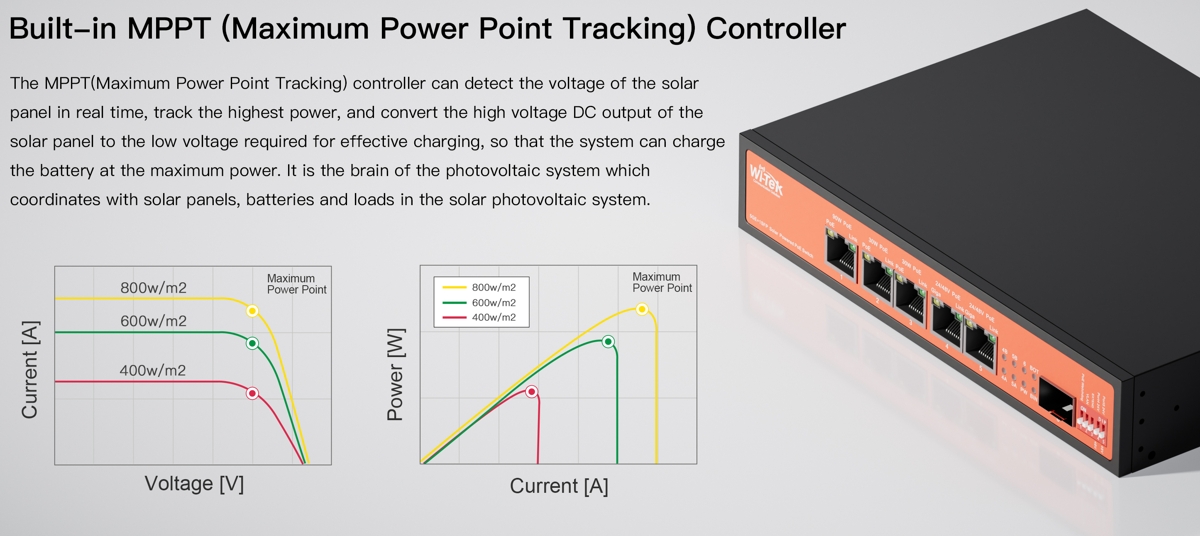 Това е автоматичен превод. Оригиналния текст може да видите тукWi-Tek WI-PS306GF-UPS V4 е гигабитов PoE комутатор, захранван от слънчева енергия, с UPS функционалност и капацитет на превключване от 12 Gbps , (5) Gbit PoE порта и (1) SFP слот . Вграденият MPPT контролер оптимизира производителността на слънчевите панели, като следи напрежението в реално време и осигурява ефективно зареждане на батерията . Той управлява потока на енергия между слънчевите панели, батерията и свързаните товари, позволявайки на системата да работи на слънчева енергия през деня и на батерия през нощта . Комутаторът консумира <5W (без PoE товар).