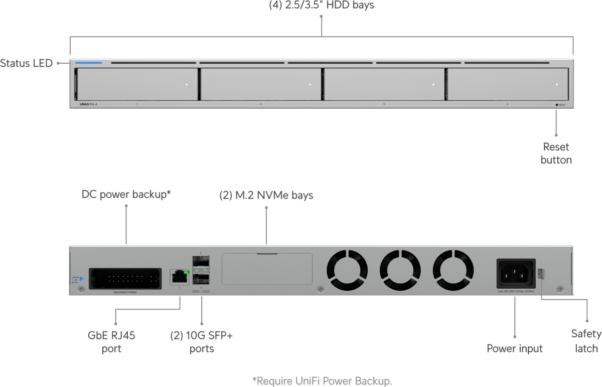 Това е автоматичен превод. Оригиналния текст може да видите тукUbiquiti UNAS-Pro-4 е мрежово устройство за съхранение в 1U rackmount форм фактор с (4) слота за 2.5/3.5" твърди дискове , (2) слота за M.2 NVME SSD дискове , (2) SFP+ слота и (1) 1Gbit порт. Устройството се захранва от четириядрен ARM Cortex-A57 процесор, съчетан с 8GB RAM, и предлага опция за резервно захранване чрез USP-RPS.