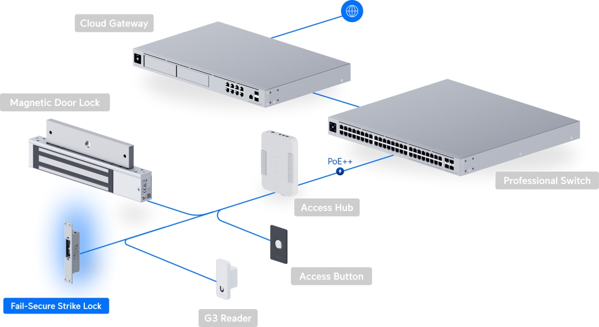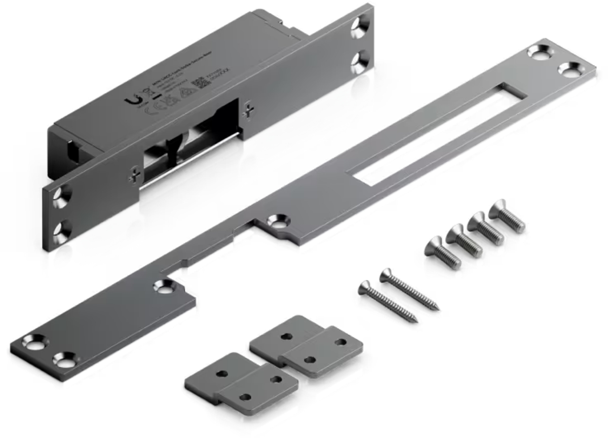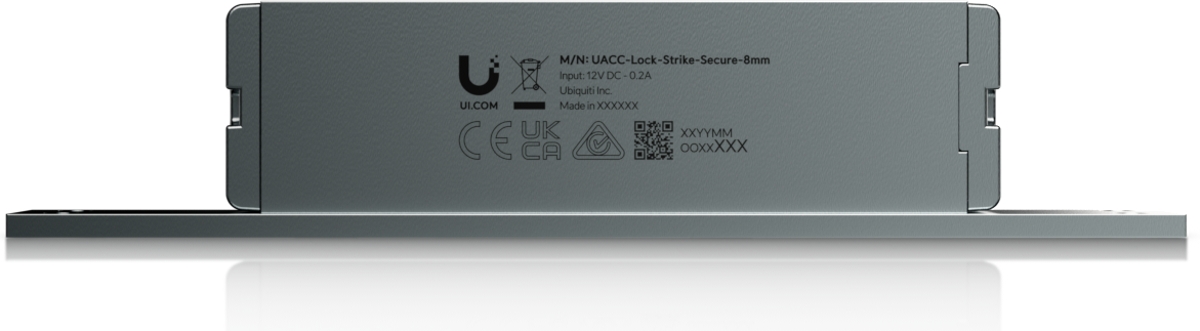 UACC-Lock-Strike-Secure-8mm е електрическа ключалка , която се свързва към UniFi Access Hub . Ключалката е обезопасена срещу повреда, оставайки заключена в случай на повреда . Може да се монтира в дървени, стоманени и алуминиеви рамки. Устройството разполага с вграден DPS (сензор за позиция на вратата), който позволява наблюдение на състоянието на вратата отворена/затворена, и има сила на задържане до 227 kg . Захранването се осигурява чрез двупроводен клемен блок 12V/200mA.