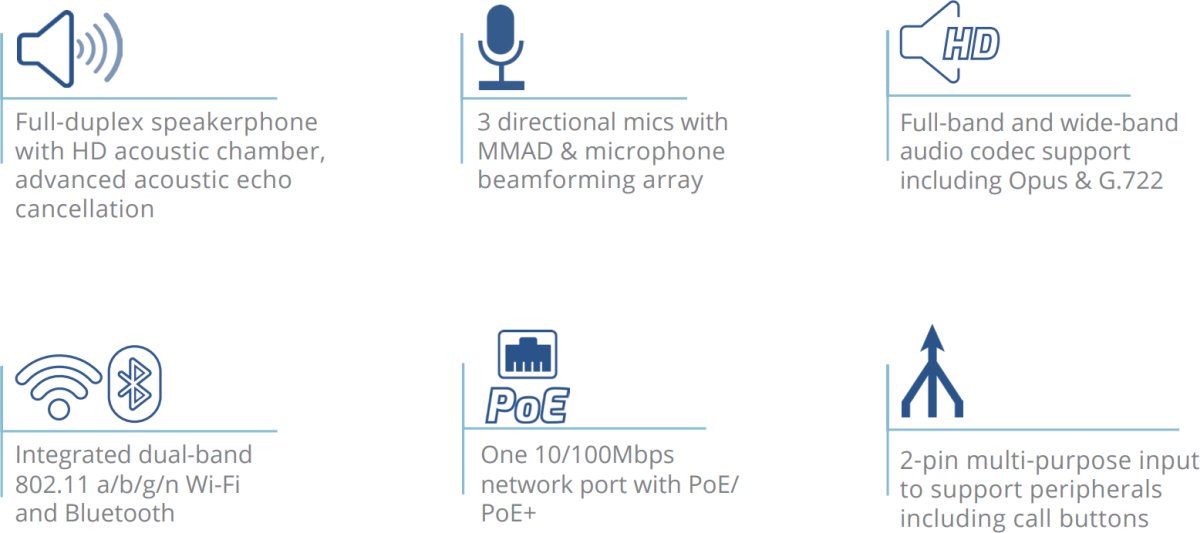 This is an automatic translation. You can see the original text hereGSC3510 este un difuzor SIP unidirecțional și, în același timp, un dispozitiv cu microfon care oferă funcții de voce HD de 8W, precum și microfoane cu trei căi cu MMAD. Distanța de preluare a vocii este de până la 4,2 m. Difuzorul este ideal pentru plasarea în birouri, școli, spitale sau apartamente. Dispozitivul poate fi foarte ușor asociat cu alte produse Grandstream, inclusiv telefoane IP fără fir. Desigur, există suport pentru multe limbi mondiale. Principalele avantaje ale dispozitivului: - Anulare ecou acustic - Listă de contacte permise și interzise pentru blocarea ușoară a apelurilor nedorite - Codec audio în bandă largă - Microfoane cu trei căi cu MMAD Specificații tehnice: - Interfață de rețea: un port 100MBit cu PoE / PoE + integrat - Bluetooth 4.0 + EDR integrat - Audio HD - Alimentare: PoE 802.3af clasa 3 integrată, PoE + 802.3af clasa 4 - QoS: layer 2 QoS (802.1Q, 802.1p) și layer 3 (ToS, DiffServ, MPLS) QoS - Temperatura de funcționare: 0 ° C până la 40 ° C, stocare: -10 ° C până la 60 ° C, umiditate 10% - 90% - Porturi auxiliare: un port de intrare cu doi pini, resetare - Upgrade: Firmware upgrade la TFTP / HTTP / HTTPS sau încărcare HTTP locală, aprovizionare în masă utilizând fișierul de configurare AES XML criptat - Codecuri vocale: G.711µ / a, G.722 (bandă largă), G.726-32, iLBC, Opus, G.729A / B în -DTMF în bandă și în afara benzii (în audio, RFC2833, SIP INFO), VAD, CNG, AEC, PLC, AJB, AGC, ANS - Protocoale / Standarde: SIP RFC3261, TCP / IP / UDP, RTP / RTCP, HTTP / HTTPS, ARP, IC MP, DNS (A record, SRV, NAPTR), DHCP, PPPoE, SSH, TFTP, NTP, STUN, LLDP-MED, TR-069, 802.1x, TLS, SRTP, IPv6, OpenVPN® - Conformitate: FCC: Partea 15 (CFR 47) Clasa B; UL 60950 (adaptor de alimentare); FCC partea 15C, FCC partea 15E, MPE CE: EN 55032; EN 55024; EN 61000-3-2; EN 61000-3-3; EN 60950-1; EN 301 489- 1/17; EN 300 328; EN 301 893; EN 62311; RoHS RCM: AS / NZS CISPR 32/24; AS / NZS 60950.1; AS / NZS 4268 IC: ICES 003, RSS 247, RSP-100, RSS 102 Conținutul pachetului: unitate, injector PoE, kit de montare, ghid de instalare rapidă, licență GPL.