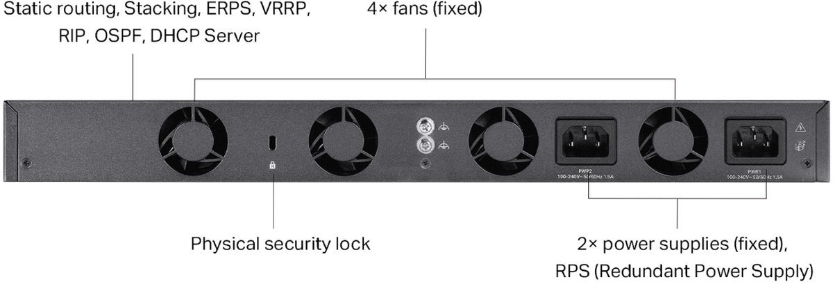 - Изключително наличен с две вътрешни фиксирани захранвания , VRRP и ERPS