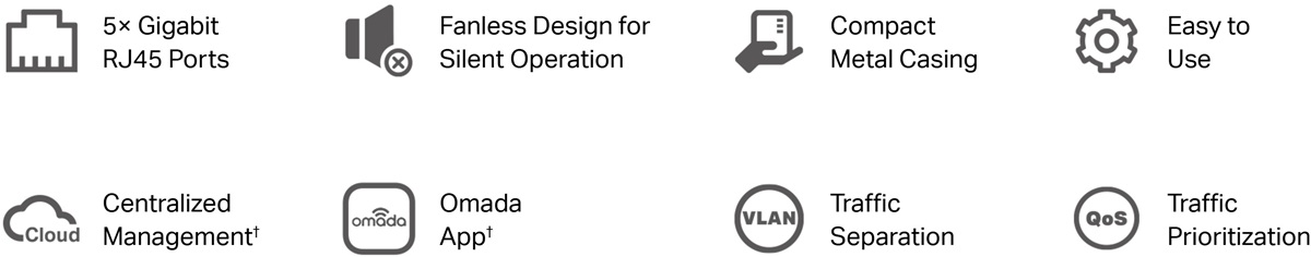 Този комутатор е оборудван с 5 порта 10/100/1000 Mbps и може да се управлява чрез уеб интерфейс или приложение. Той се отличава с издръжлив метален дизайн, безшумна работа без вентилатор и функционалности като QoS, VLAN, изолиране/оглед на портове, контрол на бурята, IGMP Snooping и други.