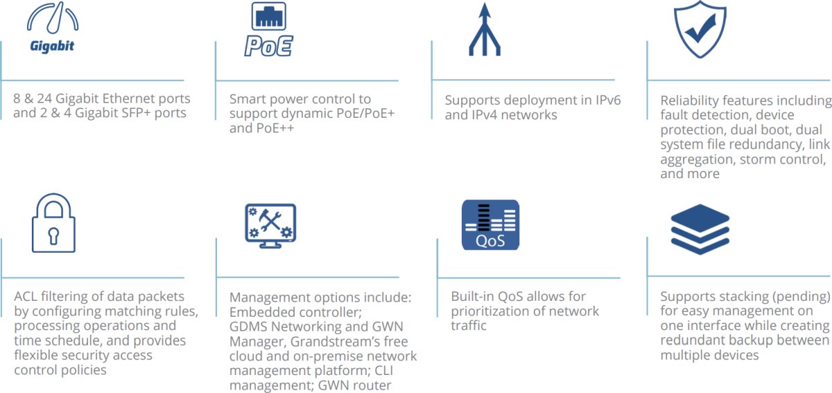 • Опциите за управление включват: Вграден контролер; GDMS Networking и GWN Manager, безплатната платформа за управление на мрежата в облака и локално на Grandstream; CLI управление; GWN рутер