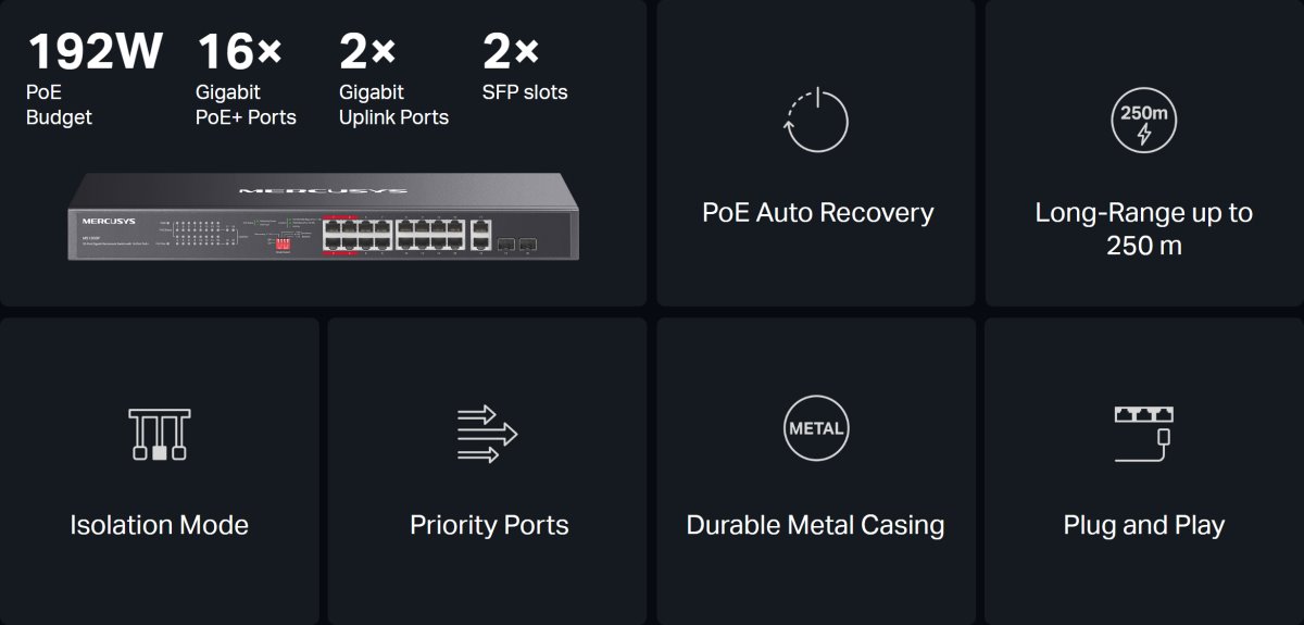 - 16× Gigabit PoE+ RJ45 порта, 2× Gigabit non-PoE RJ45 порта и 2× Gigabit SFP слота