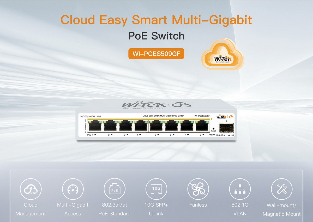 Wi-Tek WI-PCES509GF Cloud Easy Smart multi-gigabit PoE switch, 8x PoE